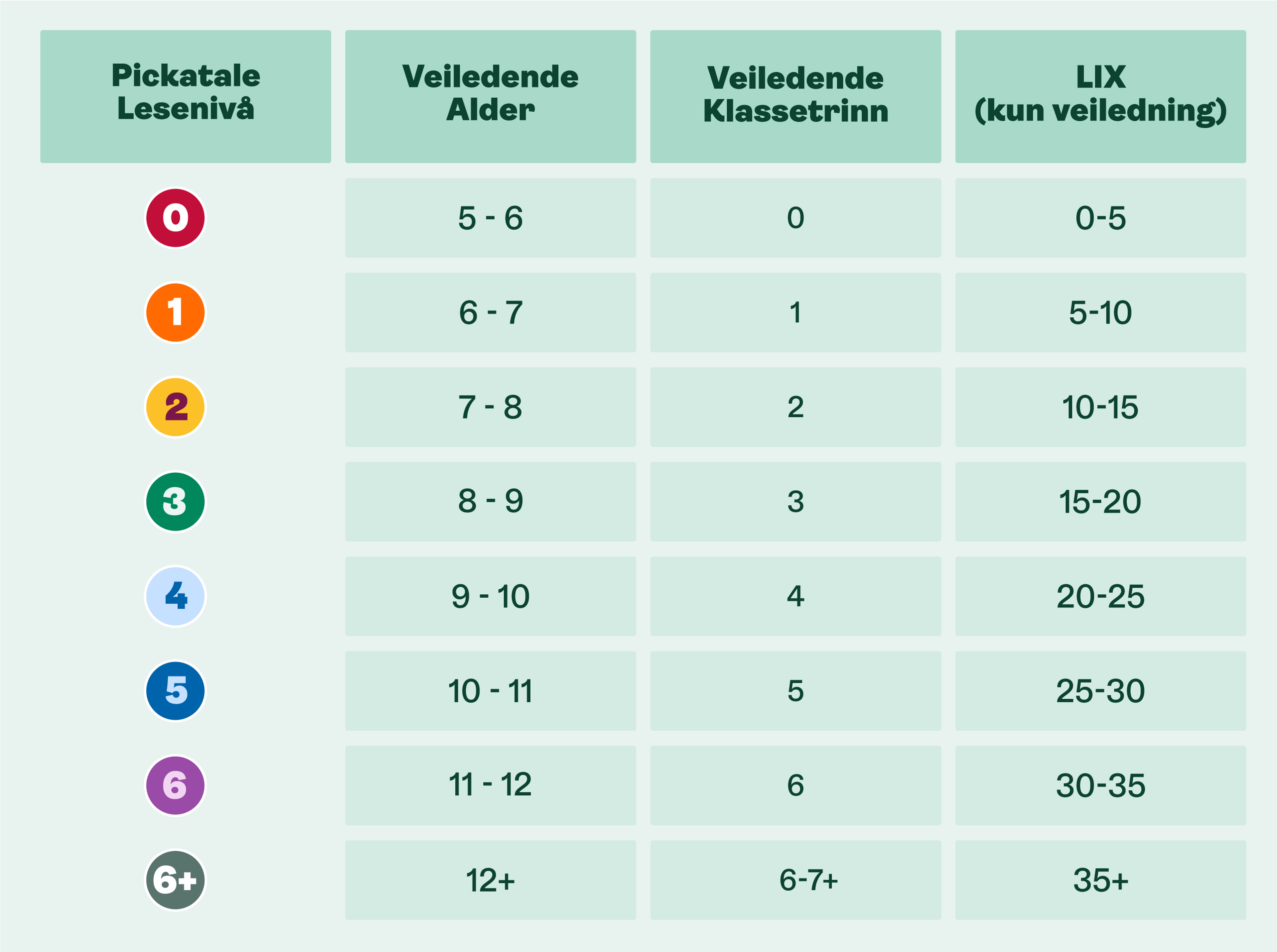 Med Pickatale lesenivåer tilbyr vi en veiledning tilpasset alder og leseferdigheter. Bøkene er plassert i nivåene etter en grundig vurdering av blant annet; format, språk, vokabular, setningsoppbygging, avsnitt struktur, innholdets kompleksitet og tema. Vi har i tillegg benyttet lesbarhetsindeksen LIX i vår vurdering.